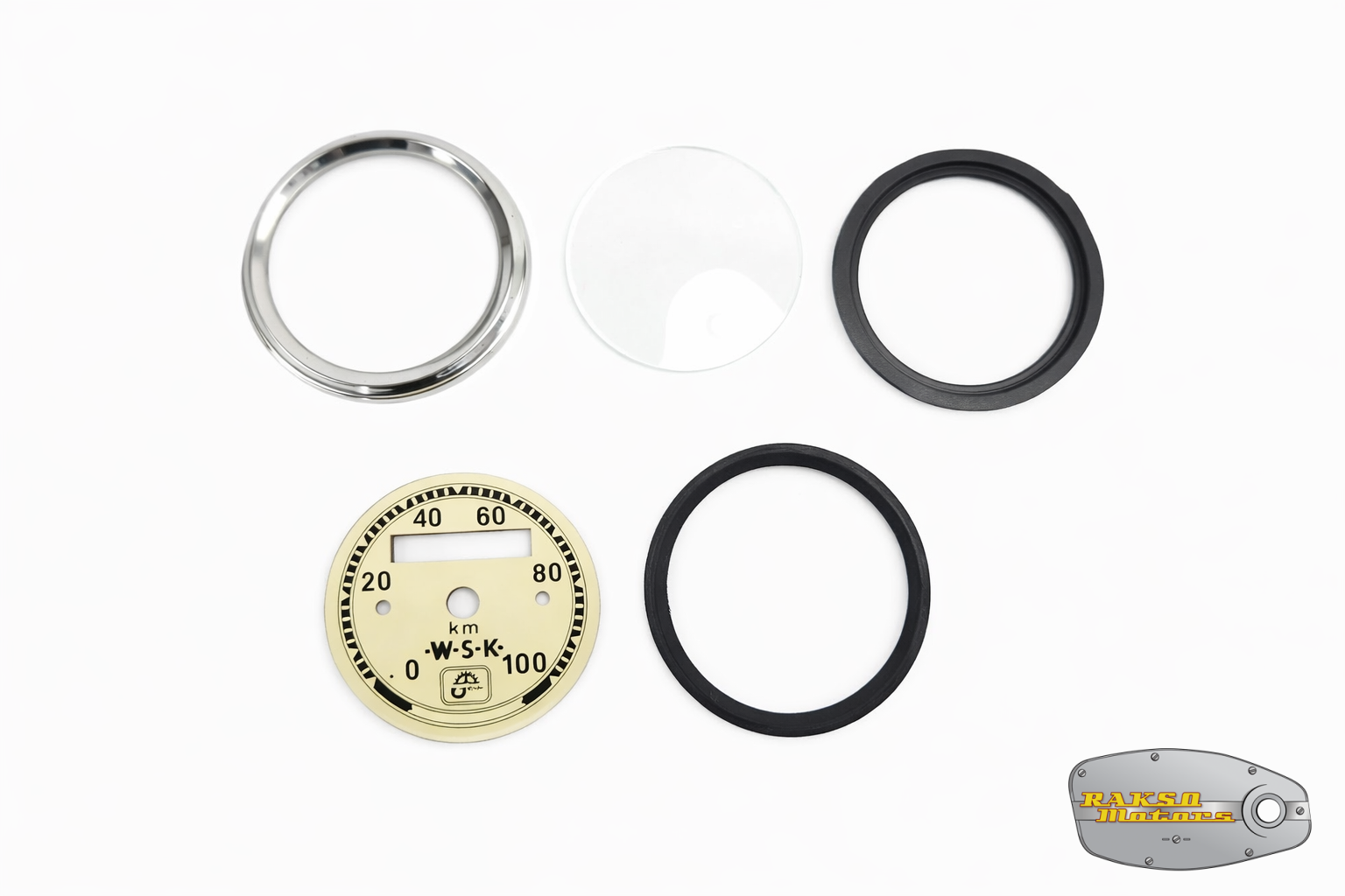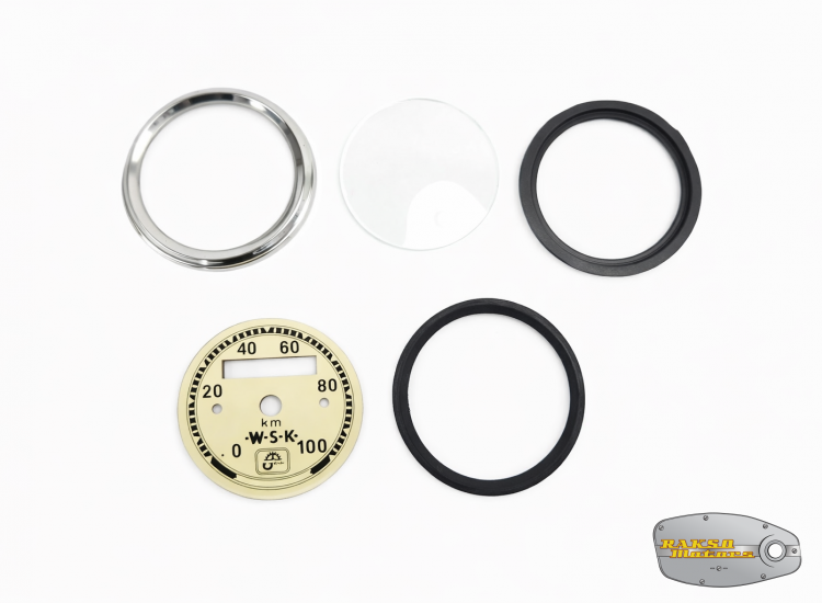 ZESTAW NAPRAWCZY LICZNIKA PRĘDKOŚCIOMIERZA WSK 100 KM/H KREMOWY (CYFERBLAT RAMKA SZKŁO USZCZELKA) - 17766